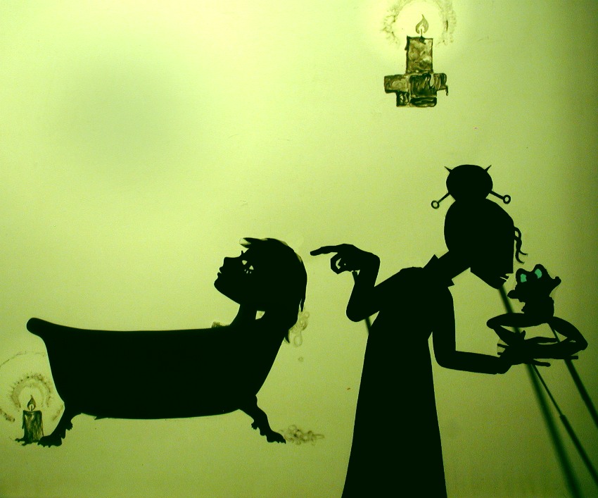 Frühmorgens ging die Königin in das Bad, nahm eine Kröte, küßte sie und flüsterte ihr zu: "Setze dich auf Elisas Brust, laß sie häßlich und dumm werden wie du, so daß ihr Vater sie nicht erkennt!"