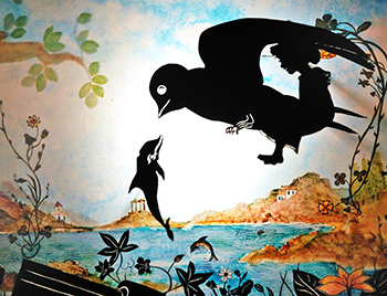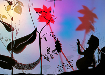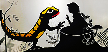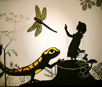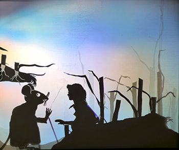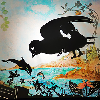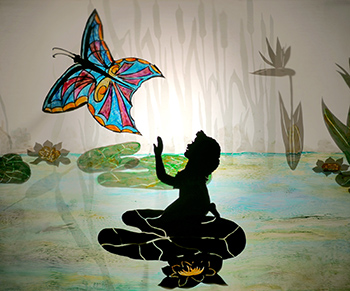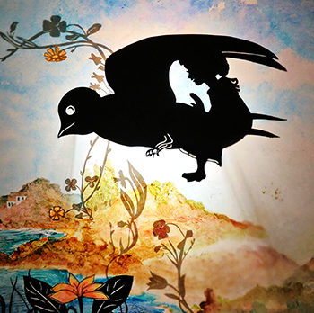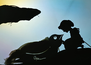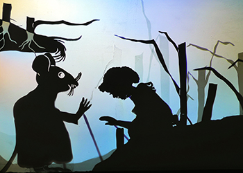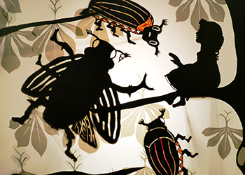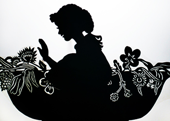 Die Stuttgarter Künstlerin Beate Schroer hat die Figuren und Bühnenbilder zu Däumelinchen entworfen und hergestellt. Es sind ihr herrliche Kontraste zwischen klassischen Schwarz/Grau/Weiß-Scherenschnittbildern und farbenfrohen Landschaften gelungen. Die zauberhaft sphärische Musik dazu hat der Dortmunder Musiker Andreas Starr komponiert. Der Text ist eng an die klassischen Übersetzungen aus dem Dänischen angelehnt und wird "live" mit Mikrofon von mir, von Friedrich Raad, erzählt. Die Aufführung wird mit 2 Spielern durchgeführt. Ich bin immer dabei und noch einer meiner freien Mitarbeiter. Die 14 Bühnenbilder, jedes 1,33m breit und 1,12m hoch, sind auf einer ungefähr 20m langen Plastikrolle ausgeschnitten und aufgeklebt und/oder mit Glasmalfarbe aufgemalt. Die Rolle selbst sitzt auf einem Kugellager und wird an der Leinwand entlang auf eine zweite Rolle gekurbelt. Die Däumelinchenfigur ist 53cm groß. Die reine Auf- und Abbauzeit beträgt ca. 40 Minuten. Däumelinchen kann in bis zu 30m langen Räumen vor bis zu 300 Zuschauern aufgeführt werden. Der Saal muß nicht dunkel sein. An geschützten Orten sind auch Vorstellungen im Freien möglich. Unsere höhenverstellbare Bühne ist 2m15 hoch, mindestens 2m, normalerweise 4m breit und 1,50m tief.