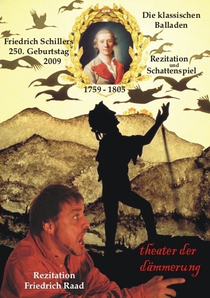Schillerballaden, einst elementarer Bestandteil des bürgerlichen Bildungsgutes, heute ein alter Hut? Die Balladen spielen im alten Griechenland, in Ägypten und im finsteren Mittelalter. Was hat ein aufgeklärter Mensch unserer technisierten Gesellschaft mit diesen alten Zivilisationen noch zu tun? Äußerlich wohl wenig, aber auf der Gefühlsebene, und auf die kommt es uns ja an, wird klar: der Mensch selber hat sich in den letzten Jahrhunderten kaum gewandelt. Noch immer wird er meist von niederen Trieben geleitet und ist- unter einer dünnen zivilisierten Oberfläche- das größte Raubtier auf unserem Planeten geblieben! Und das zeigt uns Schiller einprägsam und scharfsinnig in einigen seiner Balladen. Aber der Idealist Schiller zeigt auch Möglichkeiten zur Veredelung des Menschen auf. Vorbildlich verhält sich der charakterstarke Ritter Delorges im Handschuh, vorbildlich die Treue und gegenseitige Aufopferung der beiden Freunde in der Bürgschaft, die dann auch belohnt werden, vorbildlich die Tochter des Königs im Taucher, die dem Wahnsinn ihres Vaters Einhalt gebieten will. Wo feine Kräfte sinnvoll walten ist ein abgewandeltes Zitat aus Schillers längster Ballade Die Glocke ("wo rohe Kräfte sinnlos walten..."). Es wird ein faszinierender Einblick in die bekanntesten Balladen Friedrich Schillers gegeben. Einige Balladen werden von Friedrich Raad klassisch rezitiert, bei ca. zwei Drittel des Programmes erhält der Zuschauer mit dem Schattentheater zusätzlich einen optischen Eindruck. Das Programm kann an Hauptschulen, Realschulen und Gymnasien gespielt werden, dann meist gekürzt oder auch abendfüllend in Büchereien und Theatern. Begeistert war das Publikum in Schillers Geburtsstadt Marbach am Neckar im Humboldtsaal des Deutschen Lieraturarchives (siehe Zeitungskritik). |