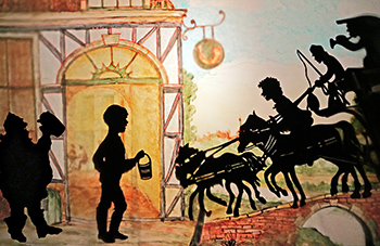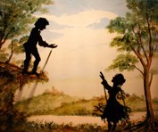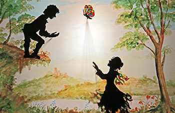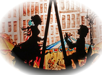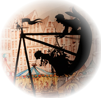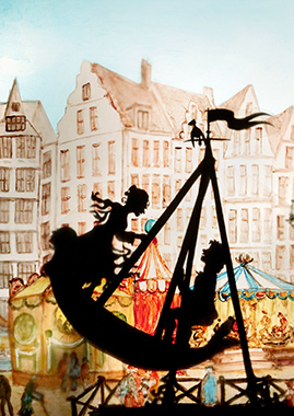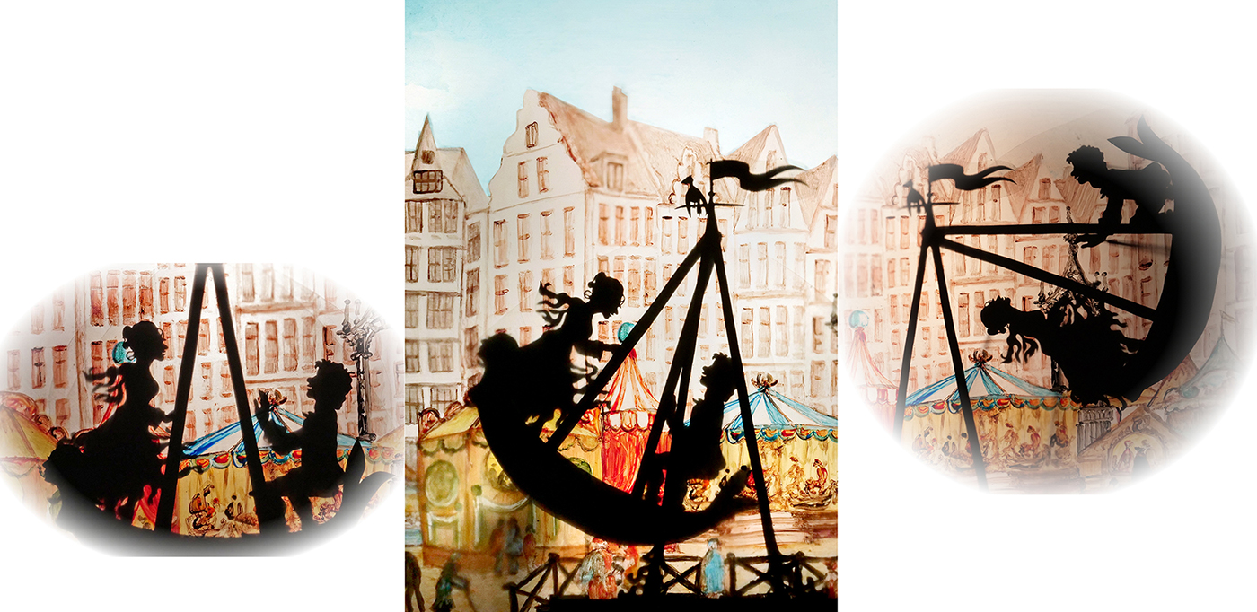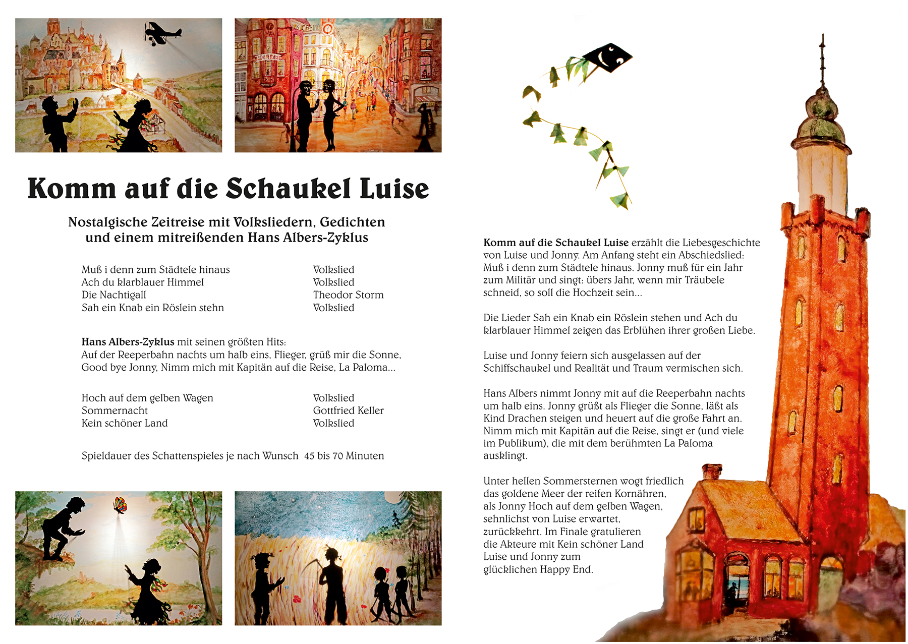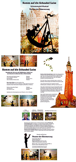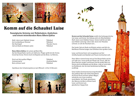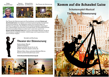 Komm auf die Schaukel Luise ist eine Liebesgeschichte, die vom Theater der Dämmerung als Schattenspiel mit ungefähr 55cm großen beweglichen Scherenschnittfiguren aufgeführt wird. Die Gedichte und Lieder