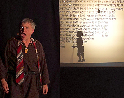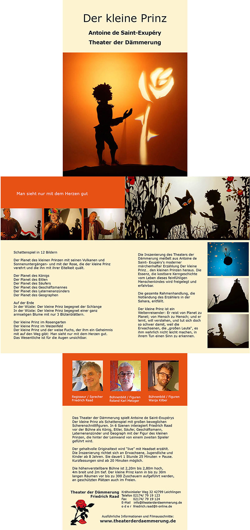 Diese sechs Archetypen verkörpert Friedrich Raad vor der Schattenbühne, während der zweite Spieler hinter der Bühne die Schattenfigur des kleinen Prinzen weiterhin mit Leben erfüllt.