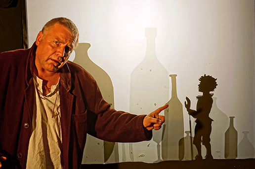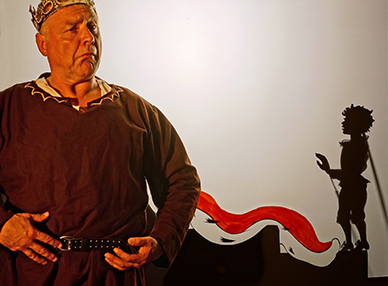Scherenschnittfiguren. In 6 Szenen interagiert Friedrich Raad vor der Bühne als König, Eitler, Säufer, Geschäftsmann,